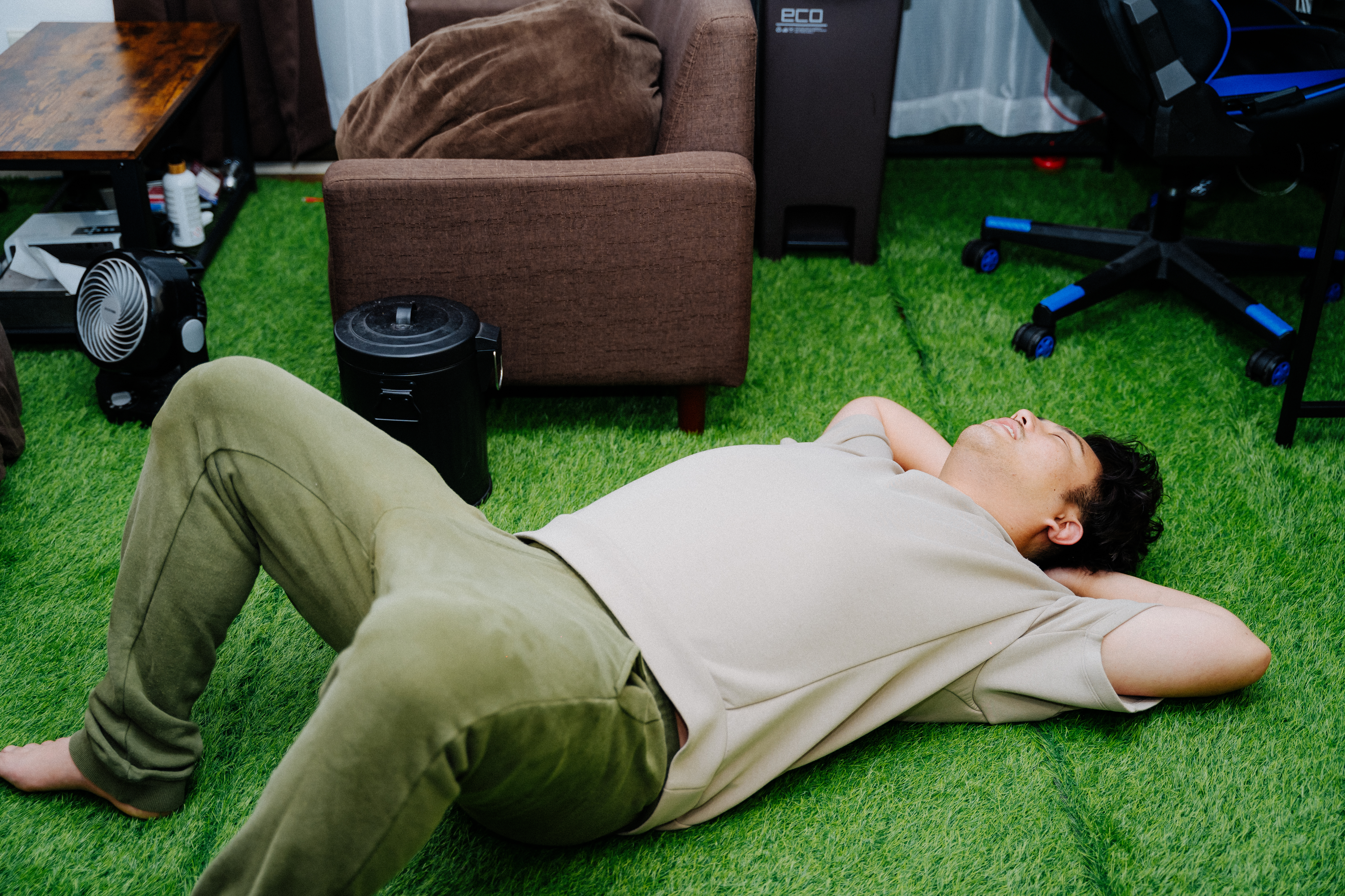 当初の目標であった家の時間を充実させるために、色々な工夫をしています。音楽は仕事してる時にテンションをあげるよう、Amazon Alexaを2台買ってマルチスピーカーにしたり。カーテンの裏にLEDつけて間接照明的な感じにしたりとかしてますね。あとは珍しいと思うのですが、床に人工芝をひいて自然を感じやすいようにしてます。